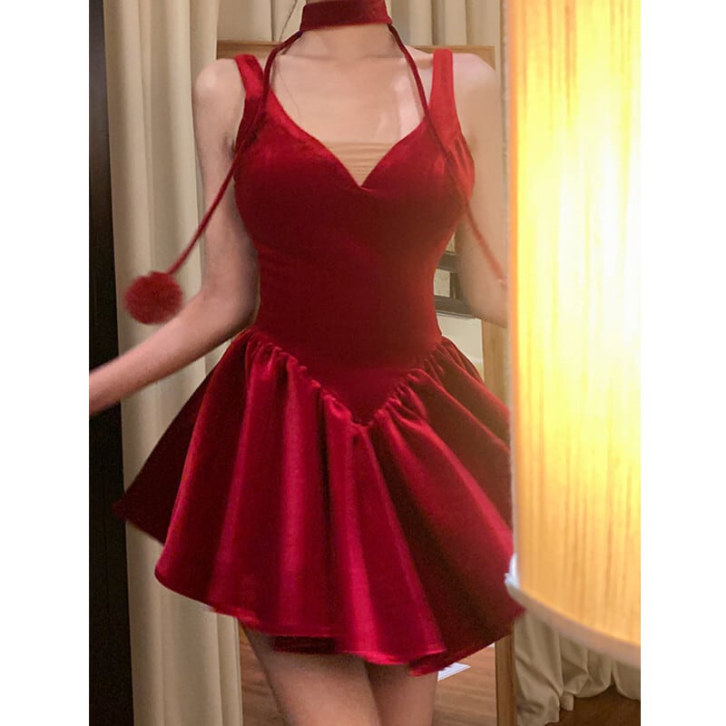 (2点セット)クリスマス 目立つ Vネック パーティー 無地 S M ワンピース80865056