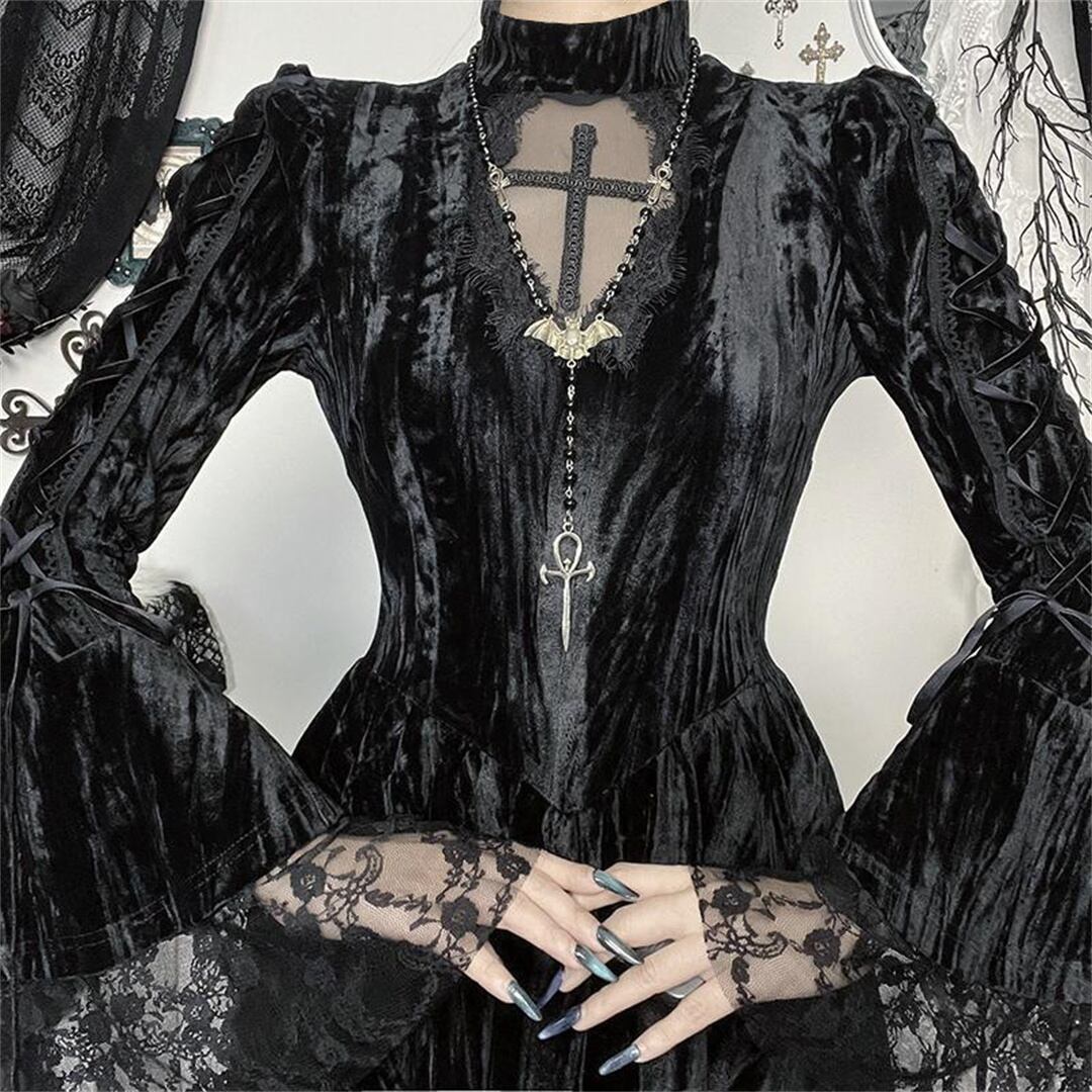 ハロウィン 女王様 暗黒系 レース 長袖 セクシー ブラック S M L ワンピース91199586